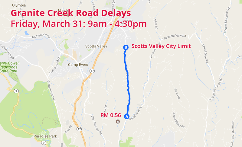 John Presleigh, Director of Public Works, County of Santa Cruz, has announced that work on Granite Creek Road from Post Mile 0.56 to Scotts Valley City limits will be subject to traffic delays from 9:00 a.m. to 4:30 p.m. Friday, March 31, 2017, weather permitting.
